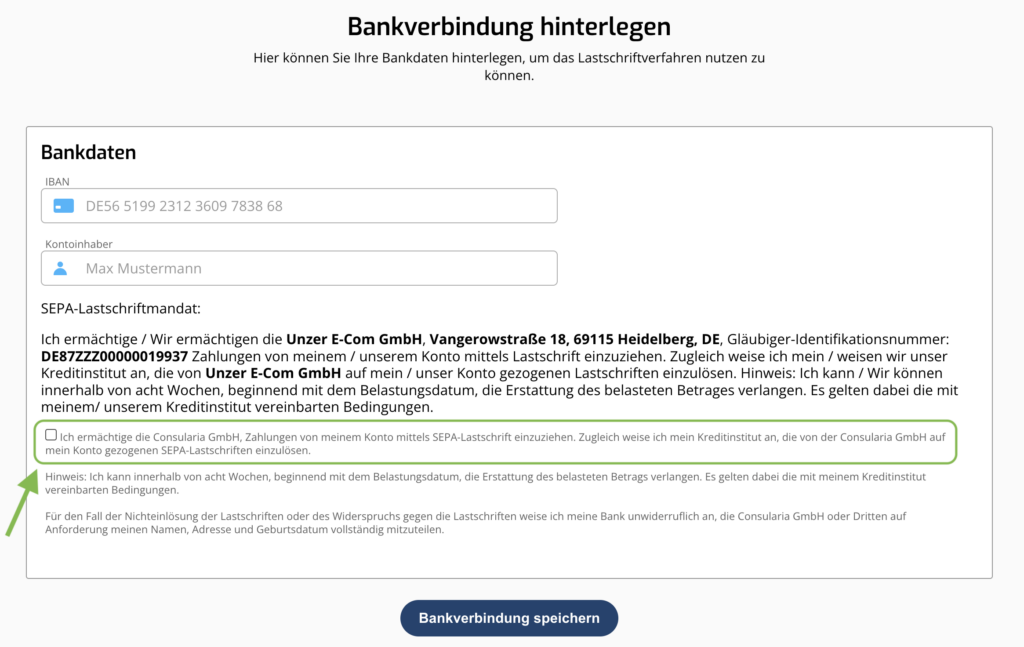 Die Zahlungsdaten werden zur Abwicklung sicher an unseren Zahlungsdienstleister Unzer weitergeleitet. Bei dem Hinterlegen einer Bankverbindung zum Lastschrifteinzug, müssen Sie das SEPA-Lastschriftmandat durch Setzen des entsprechenden Häkchens erteilen.