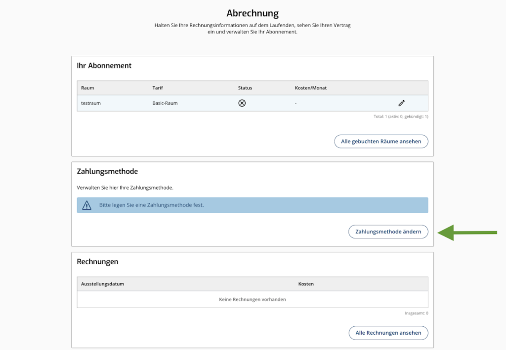 Um ein Abonnement abzuschließen, muss zunächst eine Zahlungsmethode hinterlegt werden. Wählen Sie hierzu unter »Abrechnung« den Unterpunkt »Zahlungsmethode ändern«.
