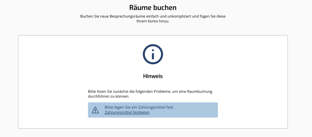 Bei Ihrer ersten Raumbuchung erscheint der Hinweis, dass Sie zunächst eine Zahlungsmethode hinterlegen müssen. Klicken Sie in dem Hinweis auf »Zahlungsmittel festlegen« und wählen Sie, ob Sie eine Kreditkarte oder eine Bankverbindung zum Lastschrifteinzug hinterlegen wollen.