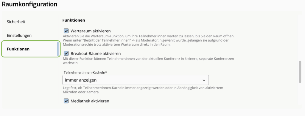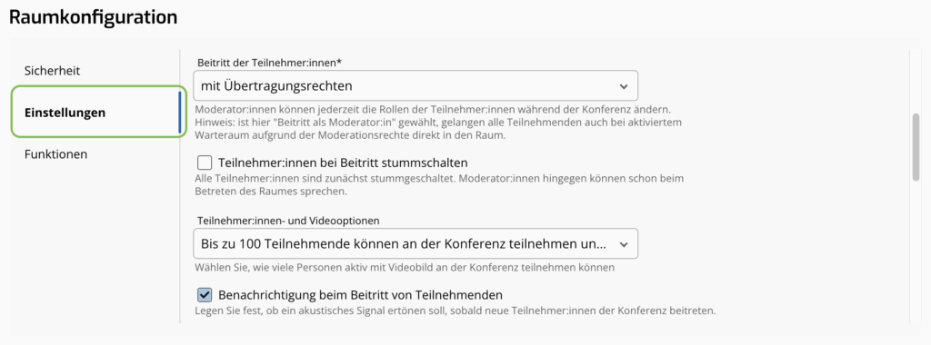 - Teilnehmer:innen- und Videooptionen (max. Teilnehmer:innen-Anzahl wählen, Hinweiston bei Beitritt ein-/ausschalten)