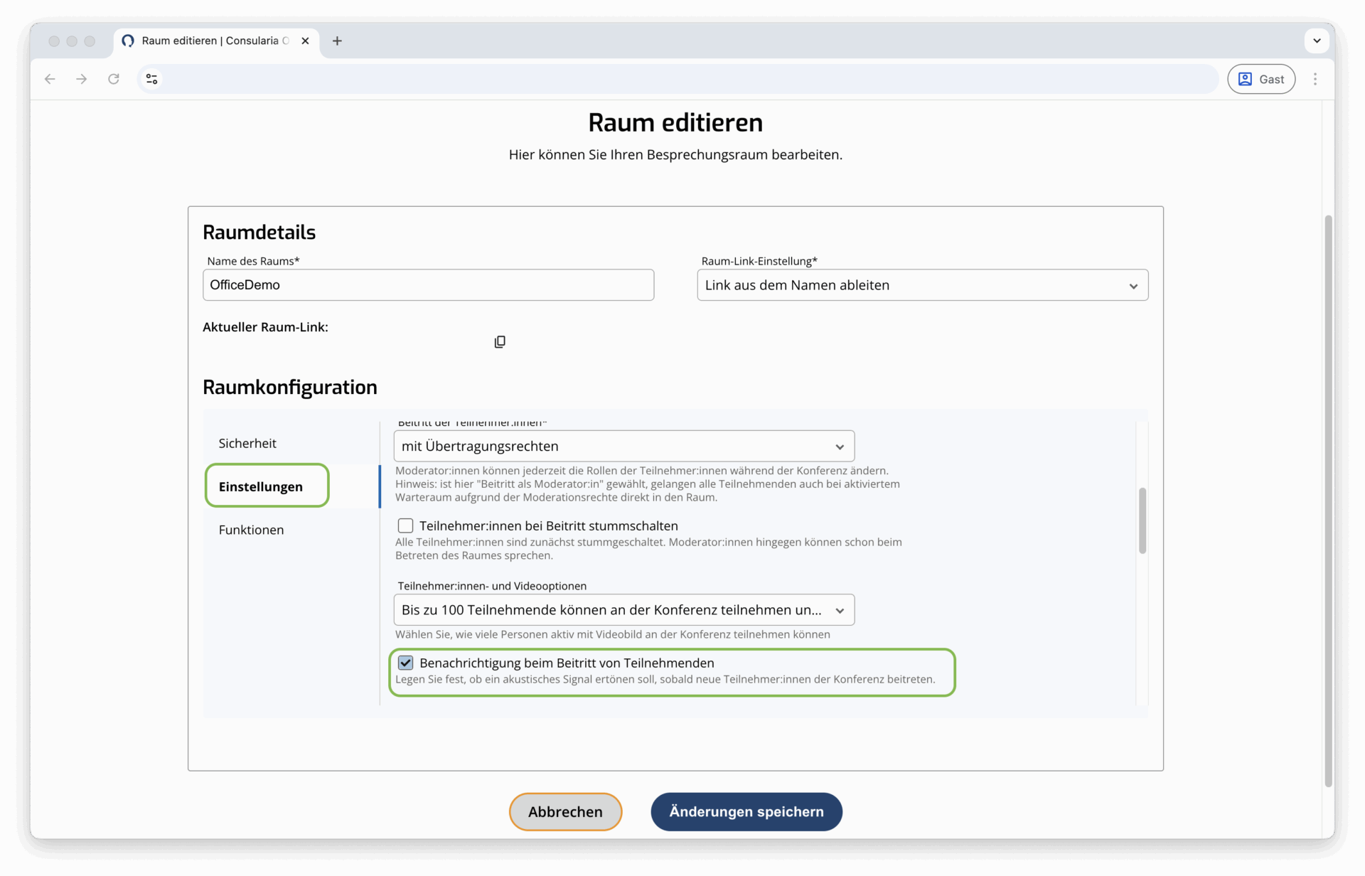 In der Raumkonfiguration können Sie unter »Funktionen« auswählen, ob bei dem Beitritt von Teilnehmer:innen in den Warteraum ein Hinweiston abgespielt wird. Setzen Sie hierfür das Häkchen bei dem entsprechenden Punkt, um den Hinweiston zu aktivieren, oder entfernen Sie das Häkchen, um den Ton zu deaktivieren. Speichern Sie die Änderungen entsprechend über die entsprechende Schaltfläche unten.