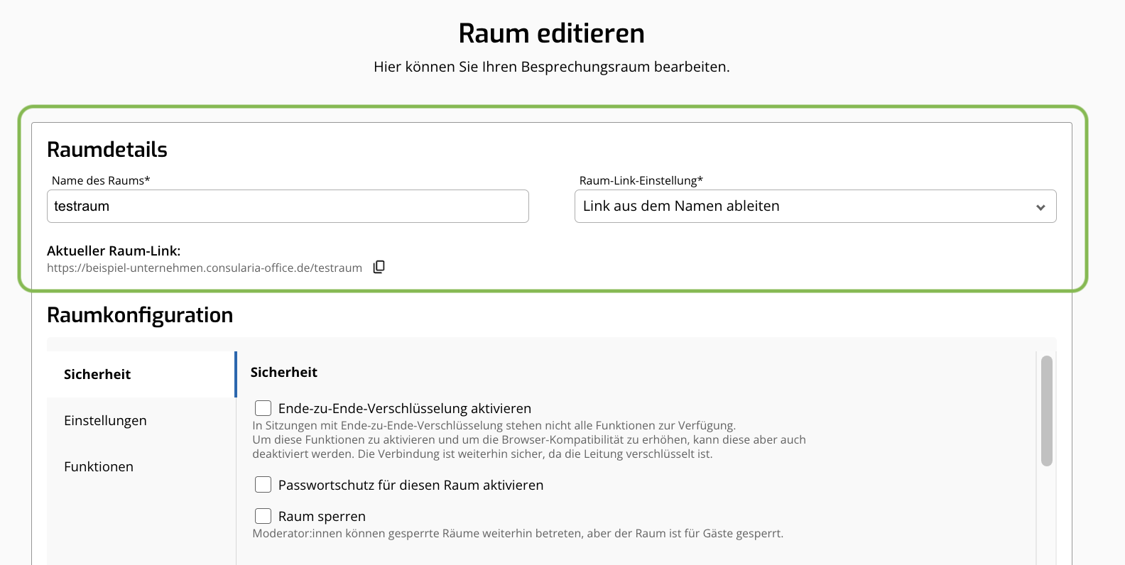 Unter »Raumdetails« können Sie die Bezeichnung des Raums und den Raum-Link bearbeiten.