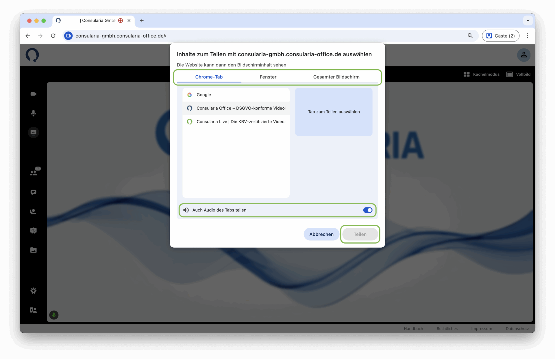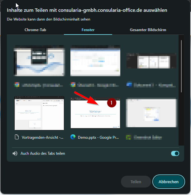 Wählen Sie dann den entsprechenden Tab / das entsprechende Fenster aus, welches Sie teilen möchten, oder wählen Sie „Gesamter Bildschirm“, um diesen entsprechend freizugeben. Wenn Sie bspw. ein Video präsentieren möchten, oder für Teile Ihrer Präsentation auch ein Audiosignal übertragen werden soll, wählen Sie beim Teilen unten „Auch Audio des Tabs teilen“ aus.