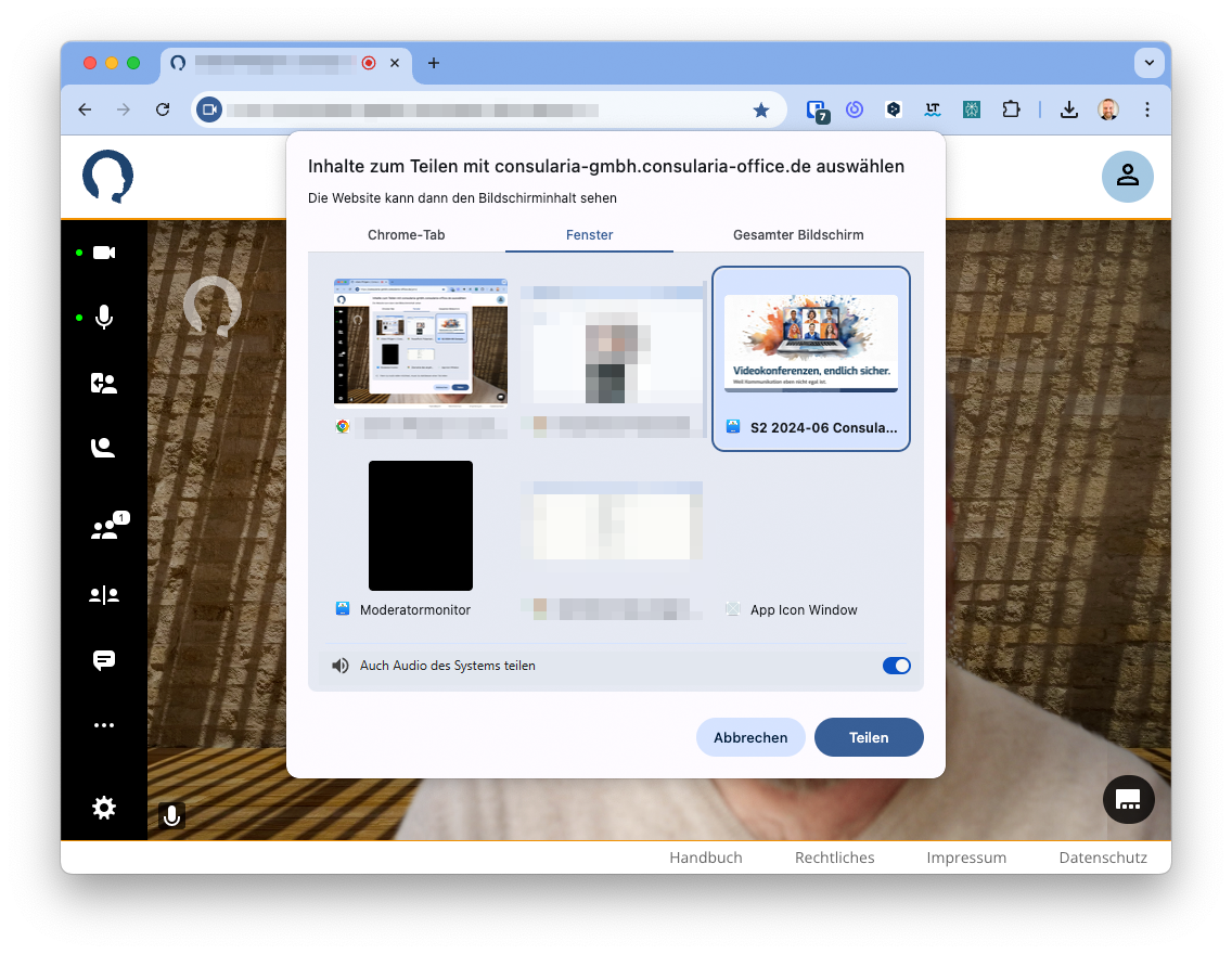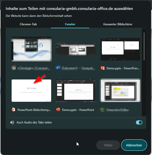 In der Konferenz (Consularia Office oder Consularia Live) gehen Sie links über die Funktion Bildschirm teilen und wählen im Reiter Fenster das Fenster aus, das die Präsentation für Ihre Teilnehmer:innen zeigt: