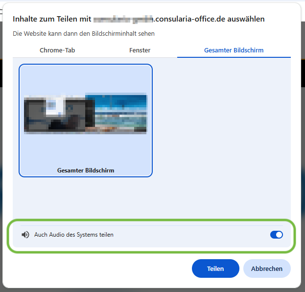 Wählen Sie dann den entsprechenden Tab / das entsprechende Fenster aus, welches Sie teilen möchten, oder wählen Sie „Gesamter Bildschirm“, um diesen entsprechend freizugeben. Wenn Sie bspw. ein Video präsentieren möchten, oder für Teile Ihrer Präsentation auch ein Audiosignal übertragen werden soll, wählen Sie beim Teilen des Tabs unten „Auch Audio des Tabs teilen“ aus. Unter Windows können Sie auch beim Teilen des gesamten Bildschirms unten auswählen, dass Ihre Audioausgabe ebenfalls geteilt werden soll.