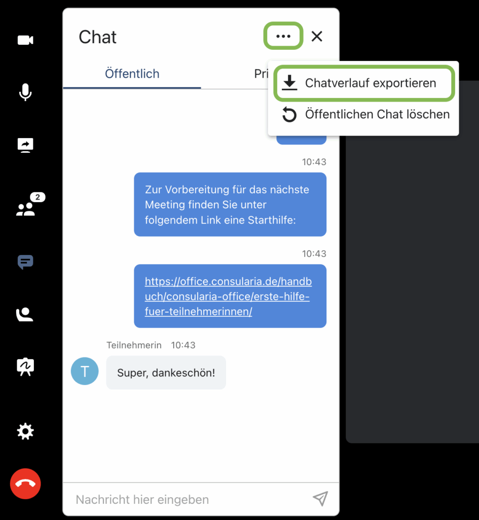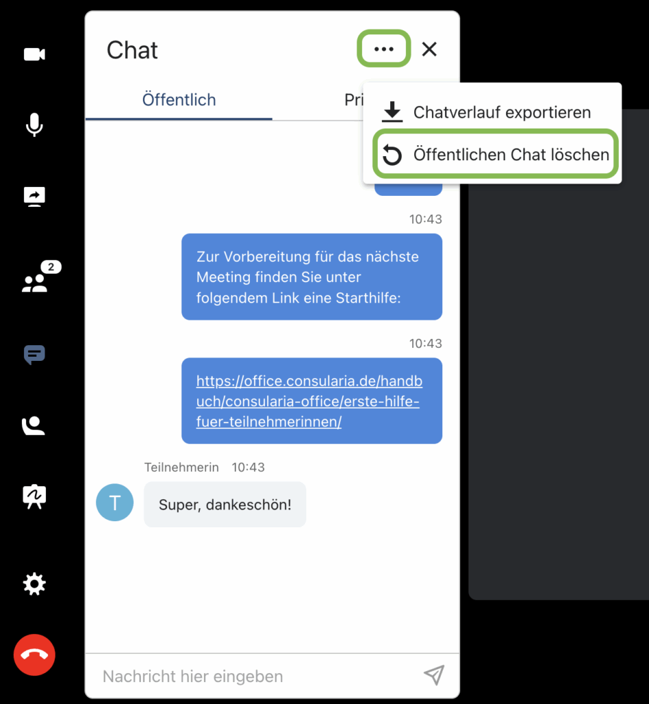 Der Inhalt des öffentlichen Chats steht allen Teilnehmer:innen innerhalb der Konferenz zur Verfügung.
